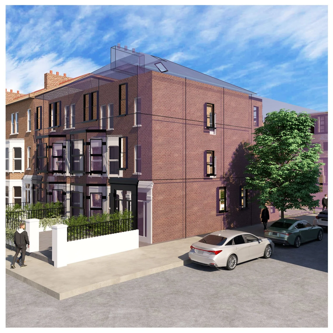The project centers on a specific site in West London where the existing street features predominantly single-family residences with consistent façades maintaining the characteristics and aesthetics of the street. My approach involves maintaining the original façade’s outward appearance by pushing back and preserving the street’s visual continuity while overlaying a contemporary mesh in front of the offset brickwork. This layered façade concept aims to address regulatory constraints by creating a visual dialogue between the old and the new. This allows the historic materiality to be visible from the street while introducing a new lightweight layer that can be manipulated.